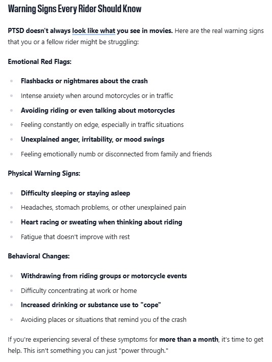 Think about your riding group. If three of you went down in crashes, statistically, one of you would develop PTSD. This isn’t rare – it’s predictable.